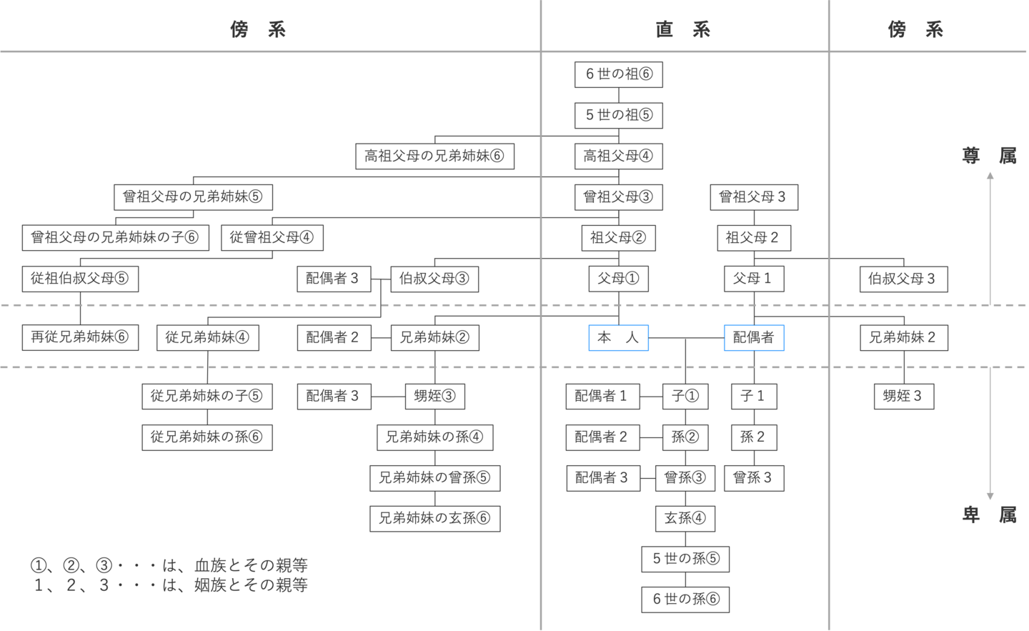 民法上の親族とは、6親等内の血族、配偶者、3親等内の姻族のことです。